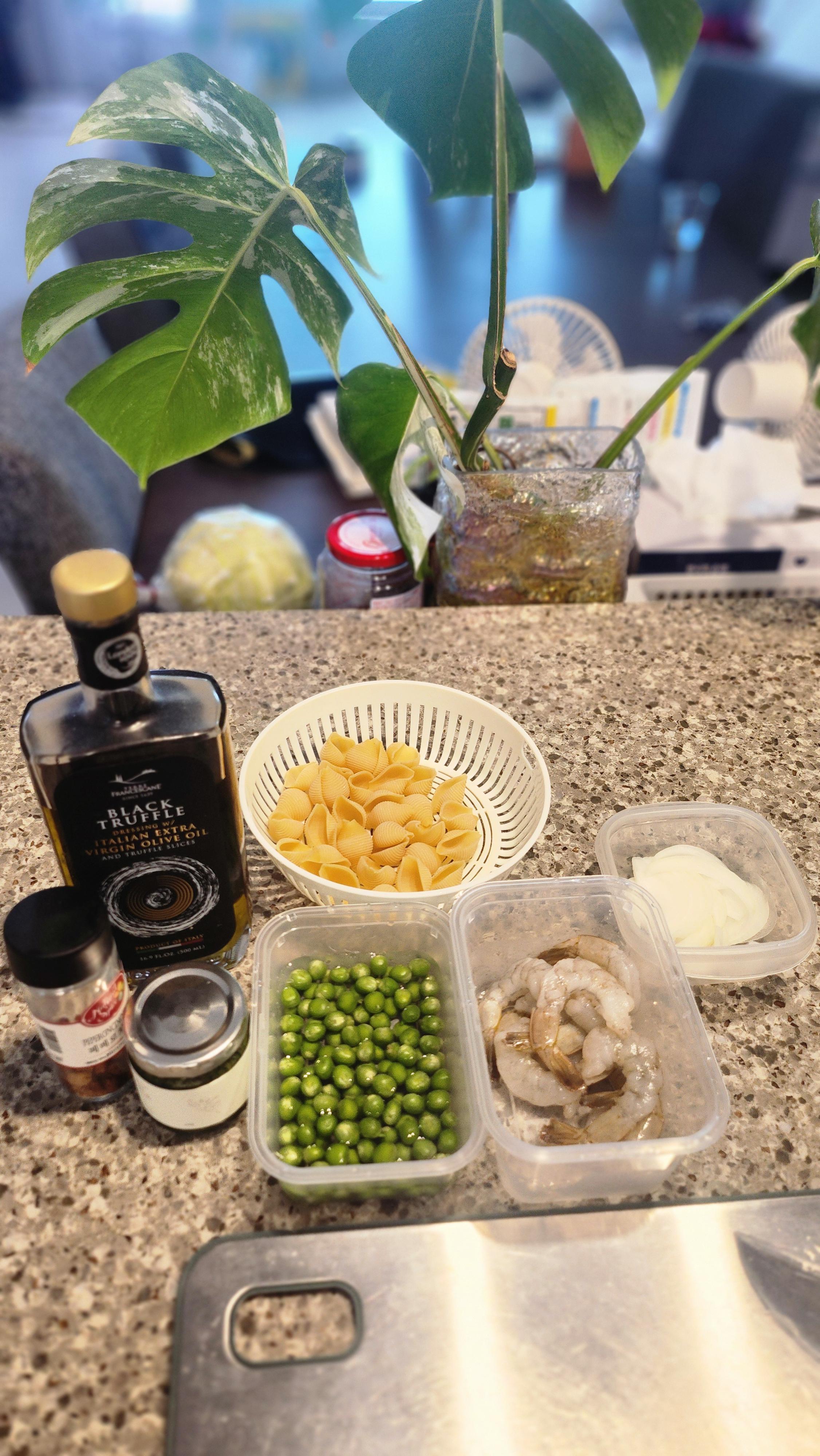 - 팬에 마늘, 페페론치노 볶고 → 새우 익히기